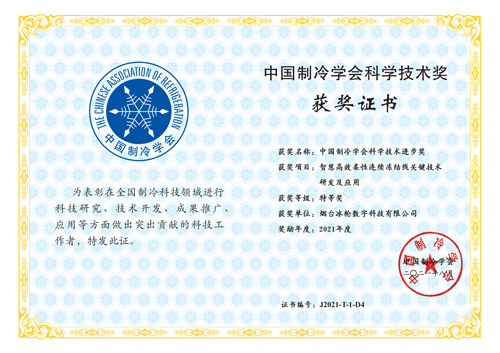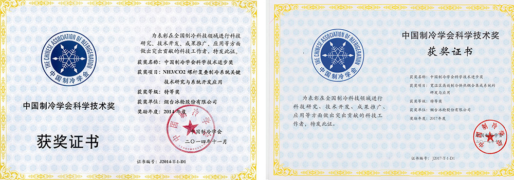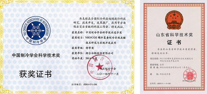 “NH3/CO2螺桿復(fù)疊制冷系統(tǒng)關(guān)鍵技術(shù)研究與系統(tǒng)開發(fā)應(yīng)用”獲山東省科技進(jìn)步一等獎(jiǎng)和中國制冷學(xué)會(huì)科技進(jìn)步特等獎(jiǎng)。