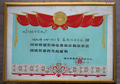 1988年11月,煙機(jī)牌4AV-12.5型氨制冷壓縮機(jī)獲國家質(zhì)量銀質(zhì)獎(jiǎng)?wù)隆?/p>